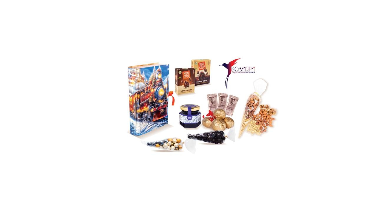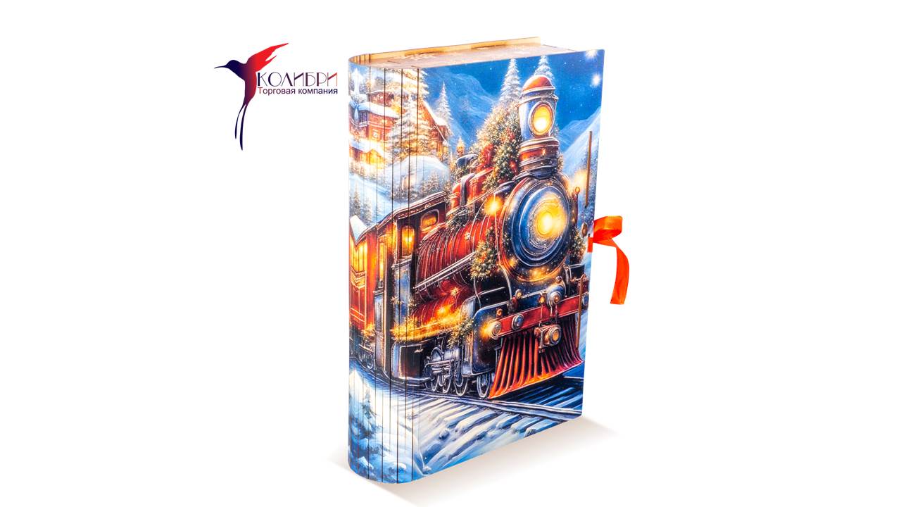 • Упаковка - коробка в виде книге "Новогодний поезд" из МДФ с полноцветной печатью, закрывается на шелковую ленту, размером 7х21х30см.;
