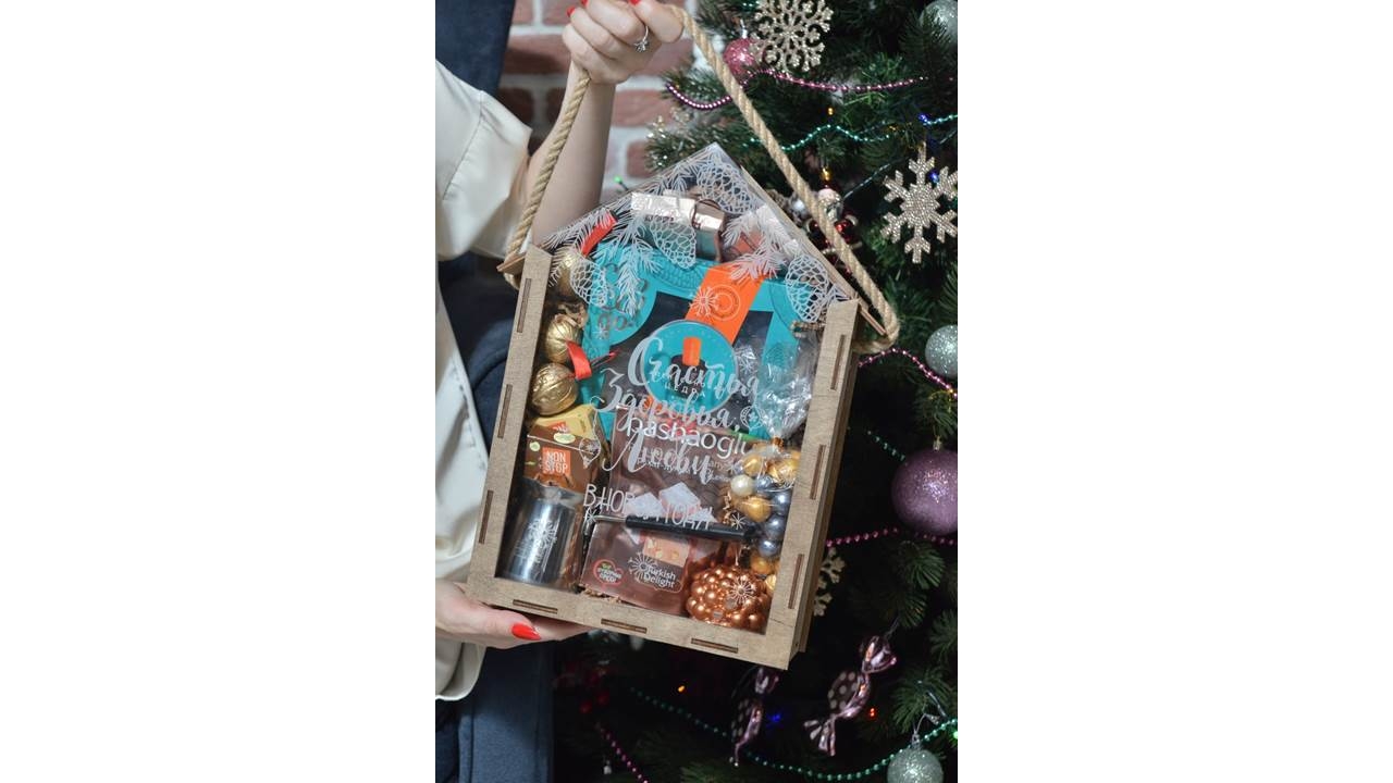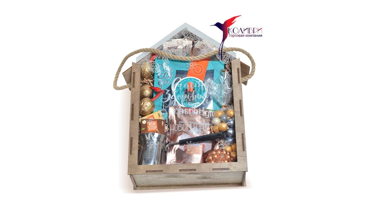 • Упаковка в виде домика из фанеры с эффектом "обжиг" с веревочной ручкой и выдвижной крышкой из орг-стекла с новогодним рисунком, размером 36х24х11 см.,